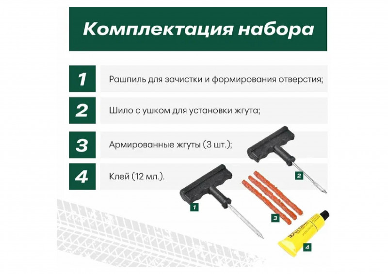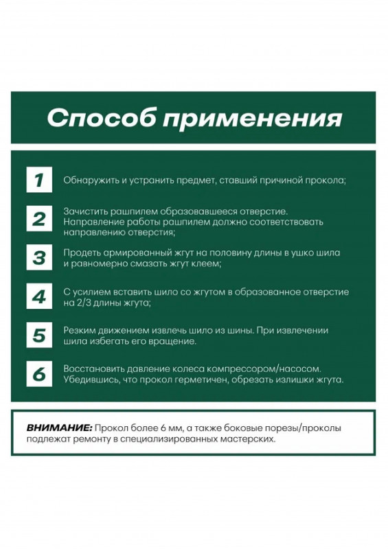 Ремонтируйте с помощью данного набора бескамерные шины после появления прокола диаметром до 6 мм в зоне протектора. Не рекомендуется применять при боковых и плечевых повреждениях.
