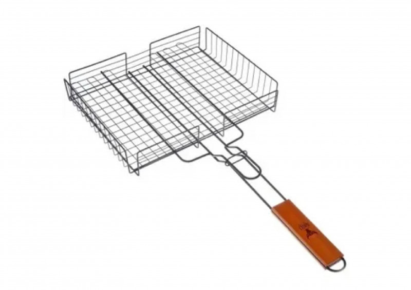 рукоятка оснащена деревянной вставкой и фиксирующей скобой, которая зажимает створки решётки.