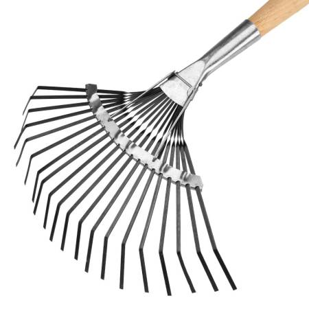 Веерные стальные грабли Сибртех 61779 размером 385 х 1500 мм, с 20 плоскими зубьями и деревянным черенком, предназначены для работы на садовом участке. Позволяют убирать мусор, листву и ветки с лужаек и грядок. Грабли поставляются в сборе с черенком и полностью готовы к эксплуатации. Преимущества: Высокий показатель прочности и упругости — грабли изготовлены из рессорно-пружинной стали. Защита от разрушения — оксидированная поверхность устойчива к образованию коррозии. Возможность интенсивного использования — благодаря усиливающей распорке на основании грабли выдерживают значительные нагрузки.
