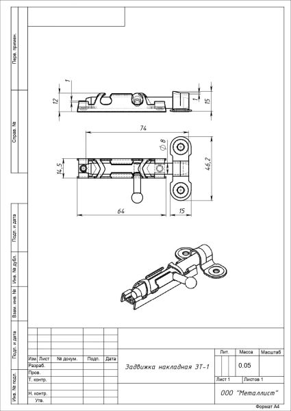 Шпингалет средний ЗТ-1 Кунгур цинк
